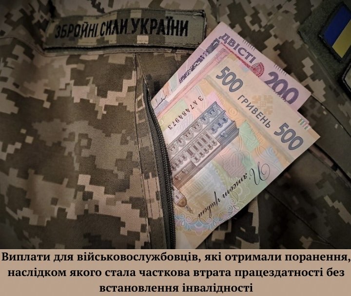 Держава гарантує виплату одноразової грошової допомоги за будь-яке ушкодження здоров’я (контузія, поранення, обмороження, мінно-вибухова травма, вивих, струс, розтягнення, розрив, перелом, отруєння тощо), отримане при виконанні обов’язків військової служби, зокрема...